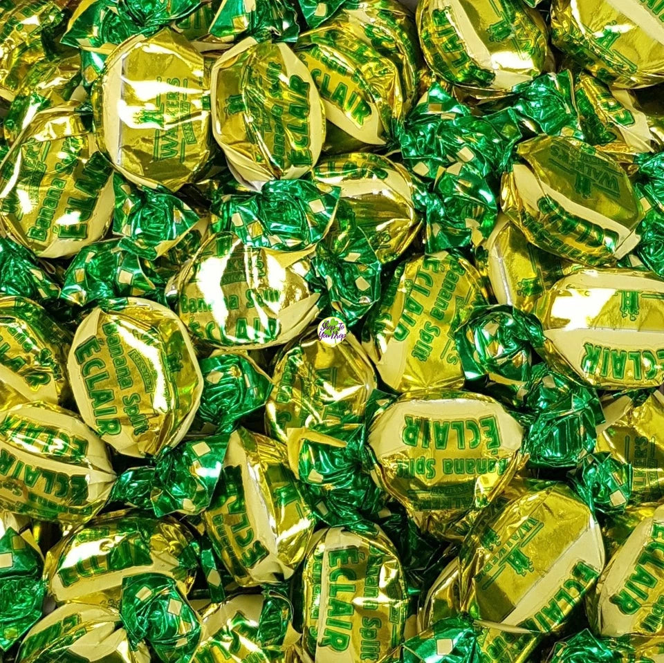 Banana Split Eclairs are a delicious twist on a classic retro sweet, combining smooth chewy toffee with a rich banana-flavoured cream centre. Individually wrapped in vibrant gold and green foil, these sweets are both eye-catching and irresistibly tasty.